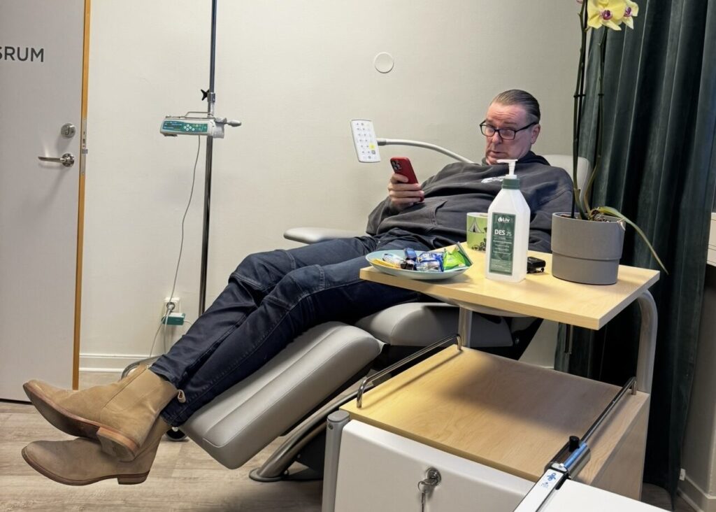 Den tidigare höjdhopparen och kollegan på Dumpen Patrik Sjöberg, följer med till kliniken och inväntar behandlingen.