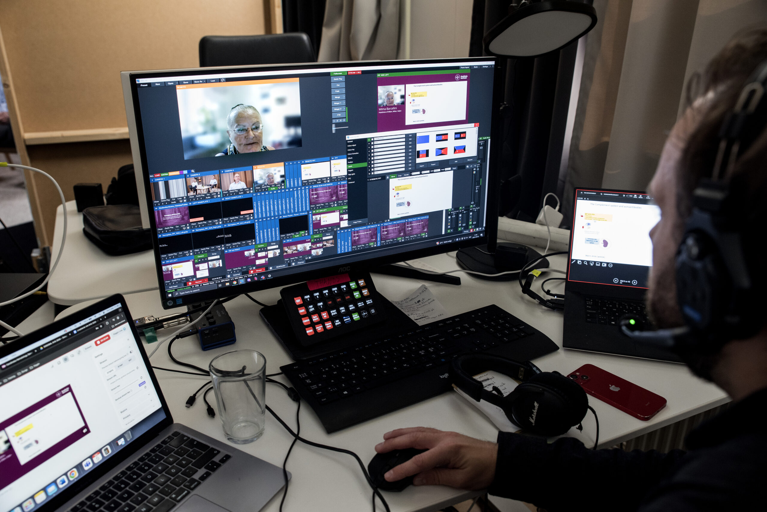 Mycket att hålla reda på för teknikerna med många internationella föreläsare med på länk. På skärmen skymtas professor Barcellini vid Universitetssjukhuset i Milano. Foto: BOSSE JOHANSSON