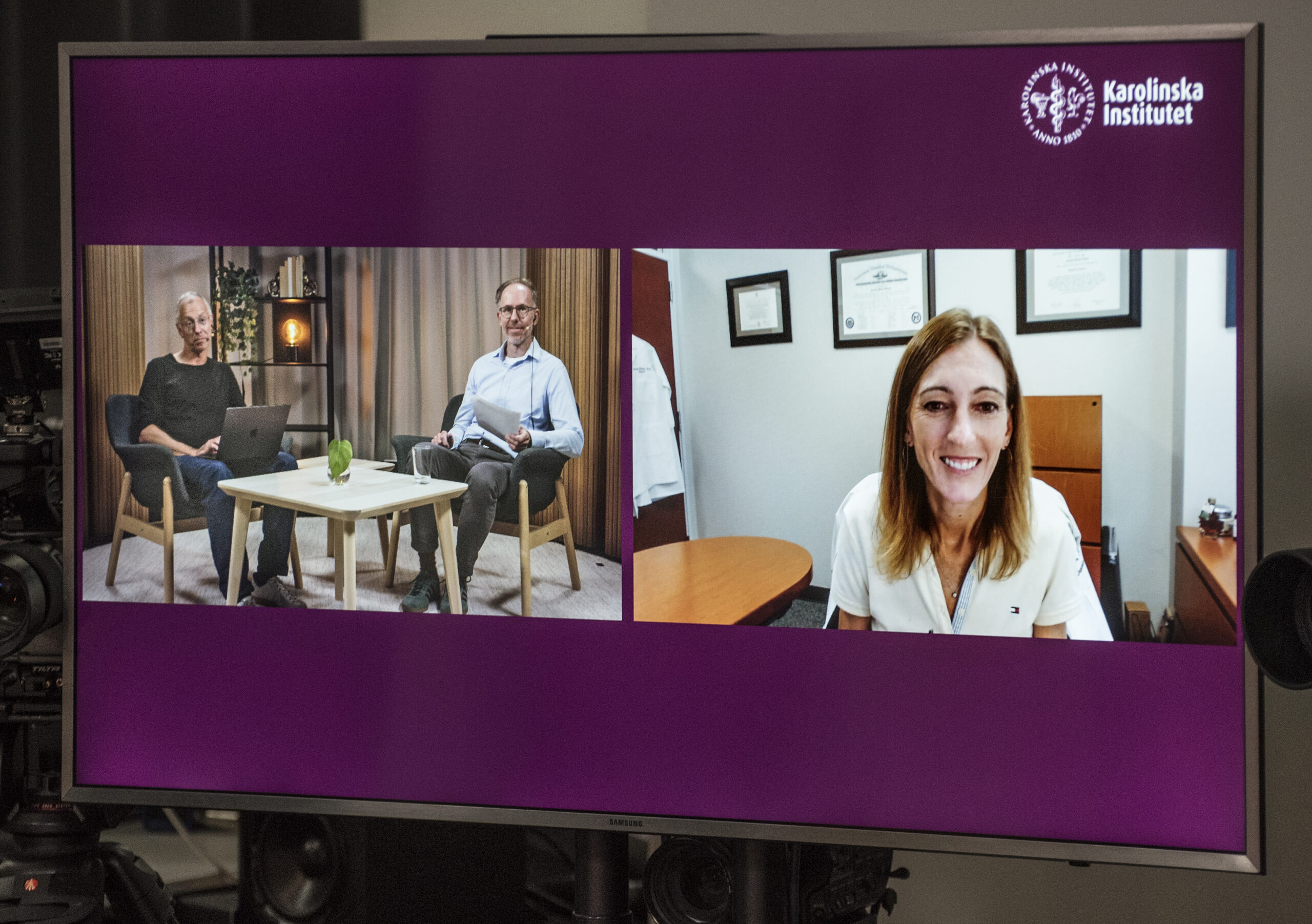 Överläkare Stefan Deneberg och överläkare Martin Jädersten till vänster modererade professor Courtney DiNardos (till höger) föreläsning om AML. Foto: BOSSE JOHANSSON