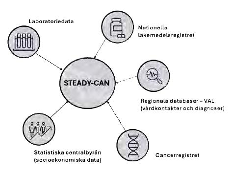 Figur. Översikt av datakällor i STEADY-CAN-kohorten. Figuren illustrerar hur kliniska data från primärvård och specialistvård, laboratoriedata, läkemedelsdata, cancerregister samt socioekonomiska data från Statistiska centralbyrån länkas i den populationsbaserade STEADY-CAN- kohorten. Figuren är modifierad från Nemlander et al., European Journal of Epidemiology, 2025.
